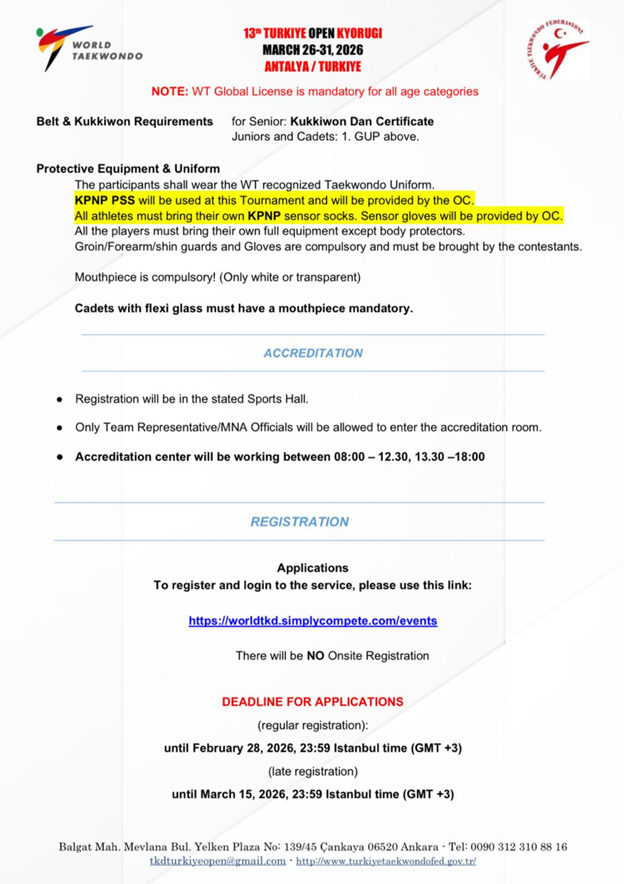 *All athletes who will participate in the tournamentCurrent international (year 2026) WT Licenseon their own responsibilityThe registration of athletes who will compete on behalf of the national team for the tournament will be handled by our Federation.